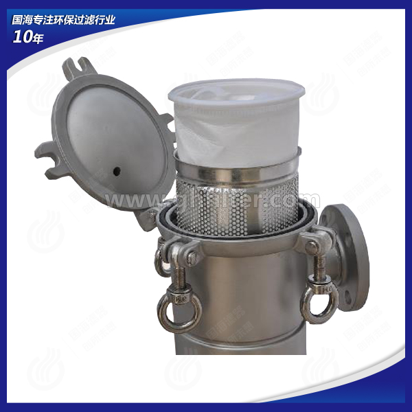 不銹鋼袋式過濾器是一種結(jié)構(gòu)新穎、體積小、操作簡便靈活、節(jié)能、高效、密閉工作、適用性強(qiáng)的多用途過濾設(shè)備。不銹鋼袋式過濾機(jī)是一種壓力式過濾裝置,主要有過濾筒體、過濾筒蓋和快開機(jī)構(gòu)、不銹鋼濾袋加強(qiáng)網(wǎng)等主要部件組成,濾液由過濾機(jī)外殼的旁側(cè)入口管流入濾袋,濾袋本身是裝置在加強(qiáng)網(wǎng)籃內(nèi),液體滲透過所需要細(xì)度等級的濾袋即能獲得合格的濾液,雜質(zhì)顆粒被濾袋攔截。具有結(jié)構(gòu)簡單合理、密封性好、流通能力強(qiáng)和操作簡便等諸多優(yōu)點(diǎn)。尤其是濾袋側(cè)漏機(jī)率很小,能準(zhǔn)確地保證過濾精度,并且更換濾袋方便快捷。