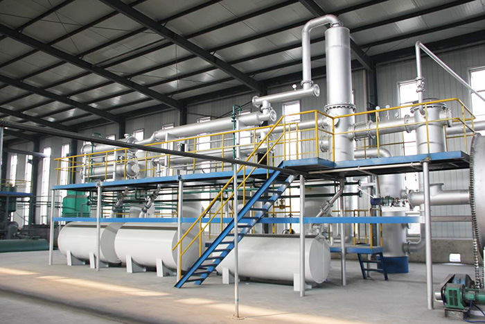 廢舊橡塑煉油設(shè)備工藝流程:將需要深加工的粗油通過油泵打入裂解鑵,再在常壓狀態(tài)下萃化加熱,餾出油氣,油氣經(jīng)催化塔進入冷凝器,可液化部分冷凝為油,不可液化部分通過廢氣回收系統(tǒng)送入加熱系統(tǒng)燒掉。冷凝后的油進入油水分離器把水分離,較后進入精制鑵脫色去味生成成品油。
