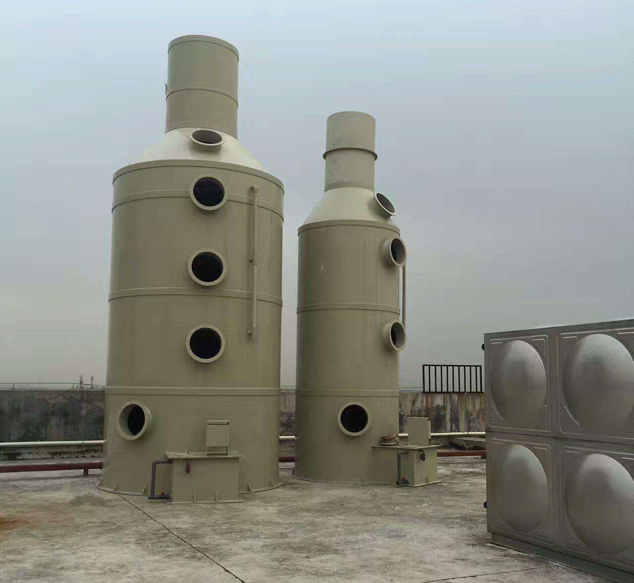 除塵塔采取氣相組分由下至上均態(tài)分布,液相組分分層同時(shí)噴淋。使得待處理的臭氣在處理倉(cāng)的每一層中都能與噴淋液和菌種完全均勻混合,從而使附著于每層處理倉(cāng)中填料上的微生物都可以充分進(jìn)行降解消化,以達(dá)到脫臭的目的。